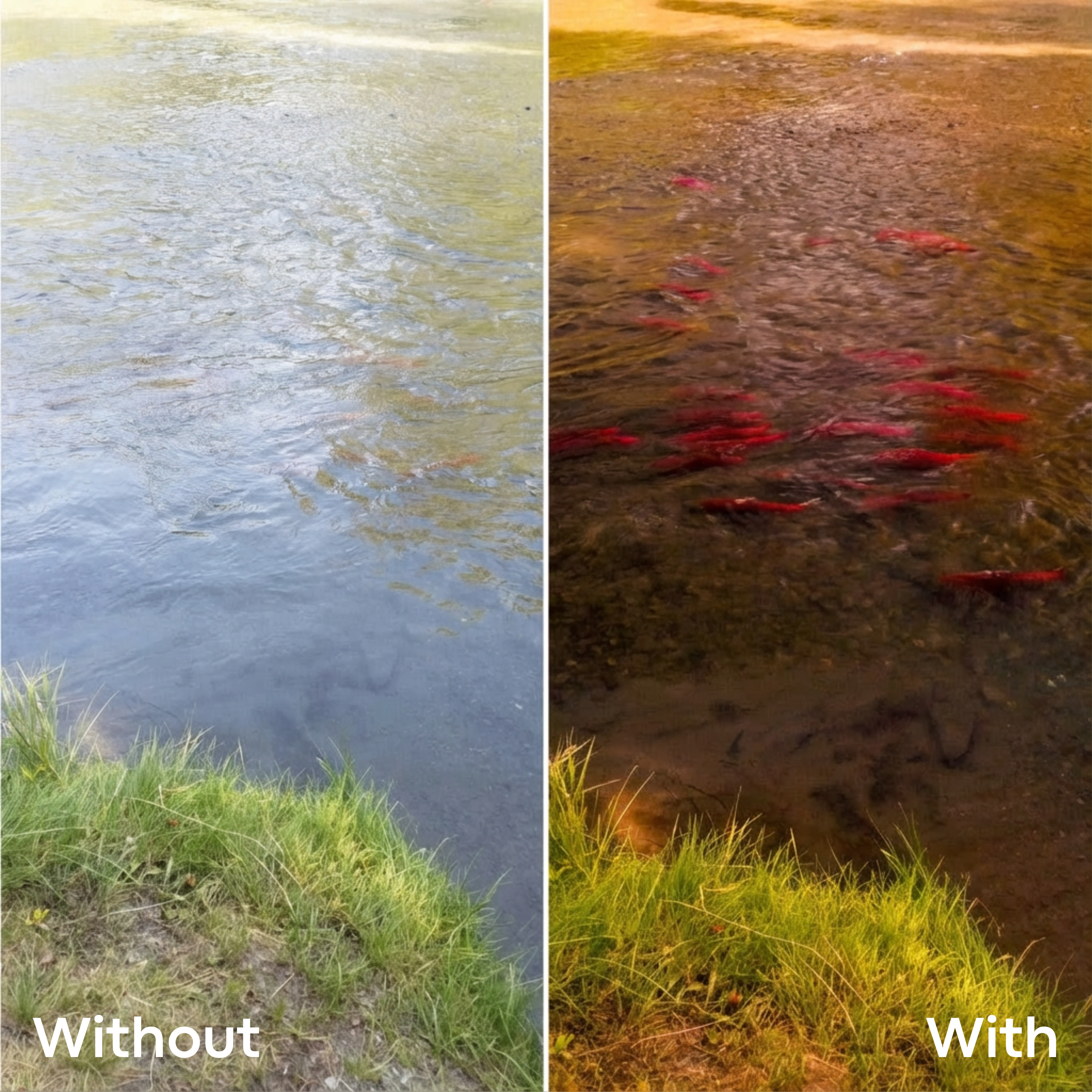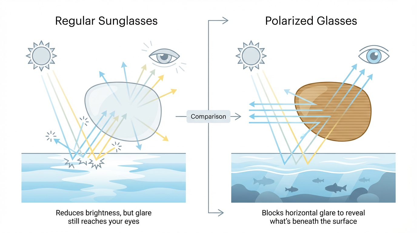 Sunlight bouncing off water creates horizontal glare that blinds you. Polarized lenses block that horizontal light while letting vertical light through — turning the water from a mirror into a window.